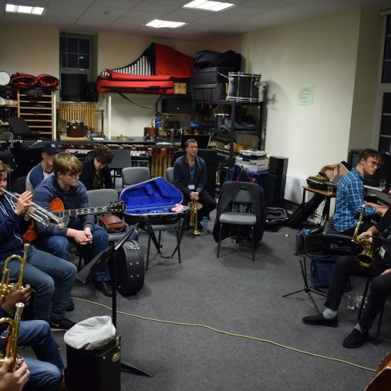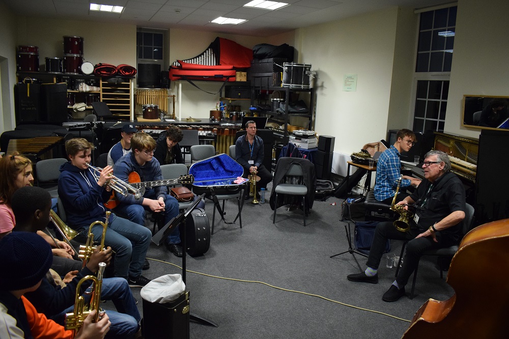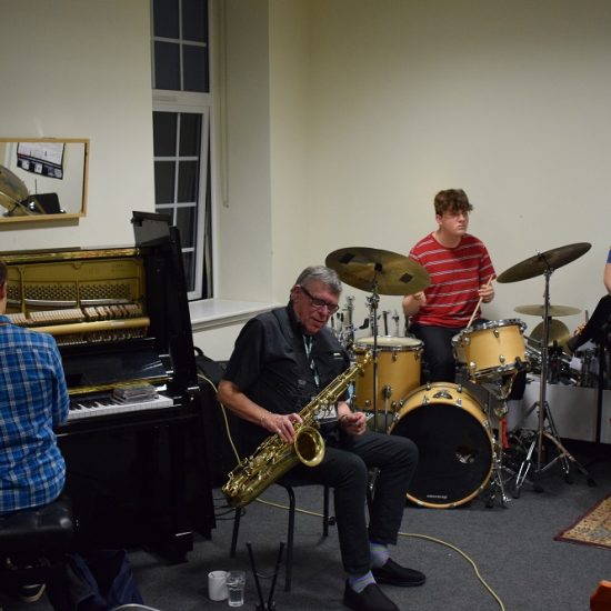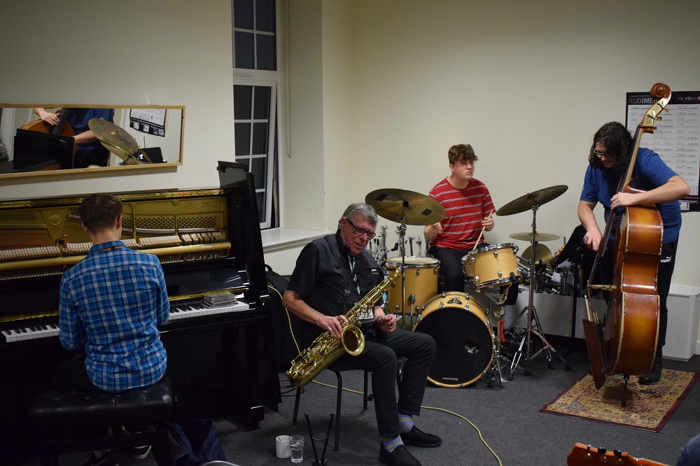 On Wednesday 27th November, the Jazz department were treated to a masterclass by the legendary saxophonist Alan Skidmore. The Percussion Suite came alive with an array of instruments as students jammed with Alan Skidmore, and found out about his life and career.