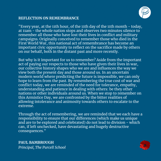 A special mention must also be made of George (Year 12) who stood alone and played the evocative The Last Post and the Reveille to mark the beginning and the end of the School’s two minutes silence.