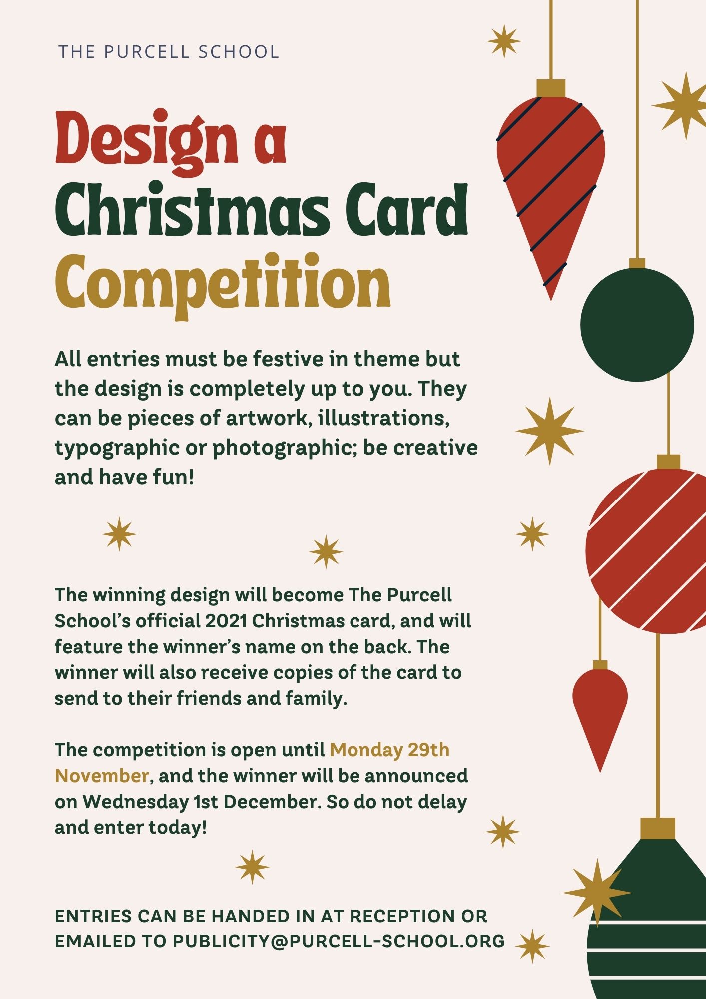 Entries can be handed in at Reception or emailed to publicity@purcell-school.org.