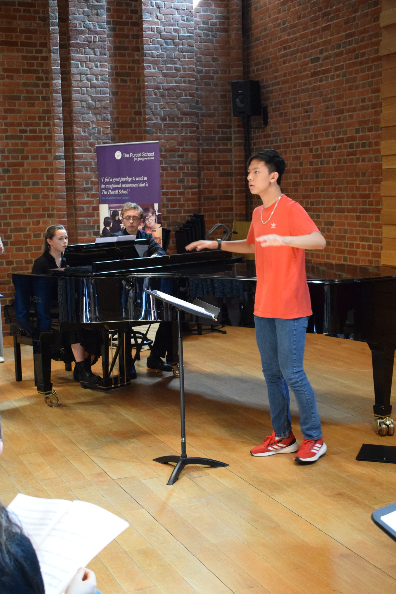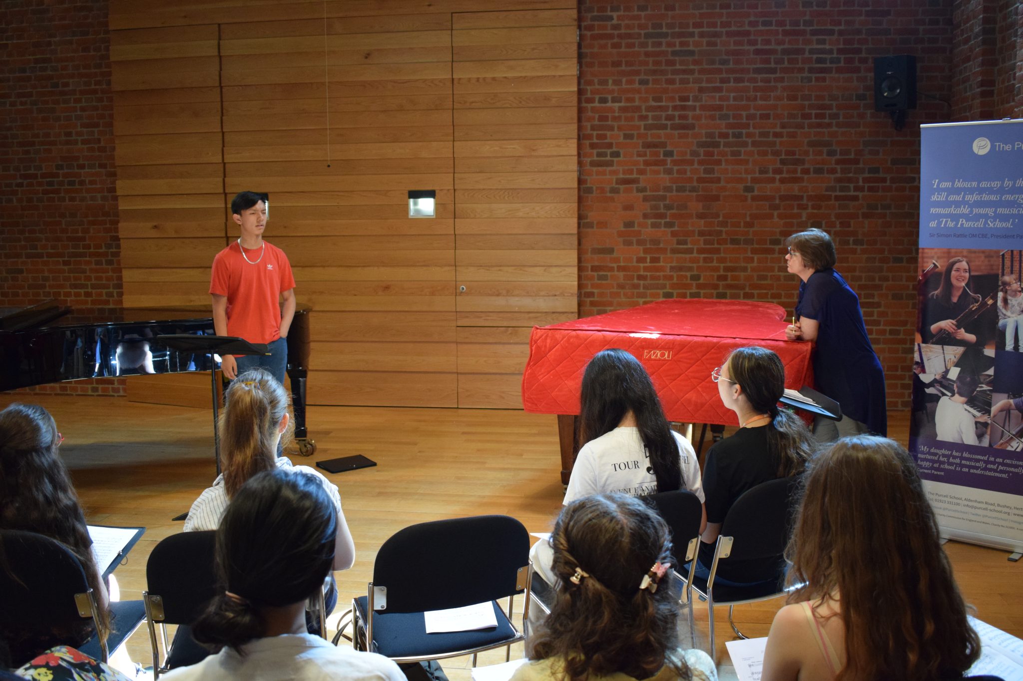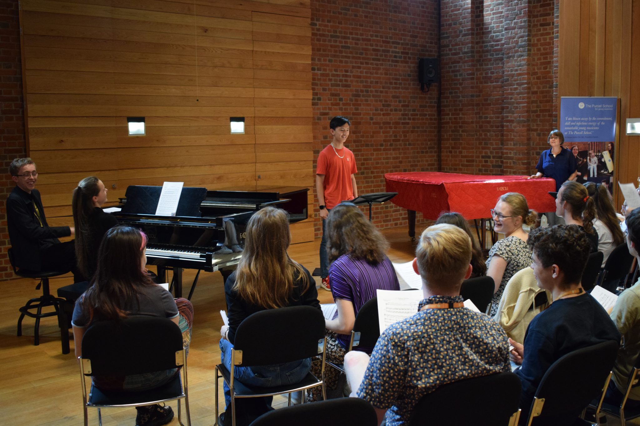 For the NATS visitors, Purcell’s Director of Music, Paul Hoskins, held a Performance Class in which Sonya (Year 8) sang a Mozart aria. This was followed by a scaled-back version of Voice teacher Tom Marandola’s Thursday Voice Class. Suanoi (Year 11), Angelina (Year 13) and Tiana (Year 13) all sang and were received rapturously by the delegates! As before Suanoi also played obligato flute in Angelina’s Bach aria and Debbie Shah, another of Purcell’s brilliant accompanists, accompanied all three on piano. The Class was followed by some brief feedback, as usual, and a short Q&A which was conducted in an atmosphere of warm mutual support.
